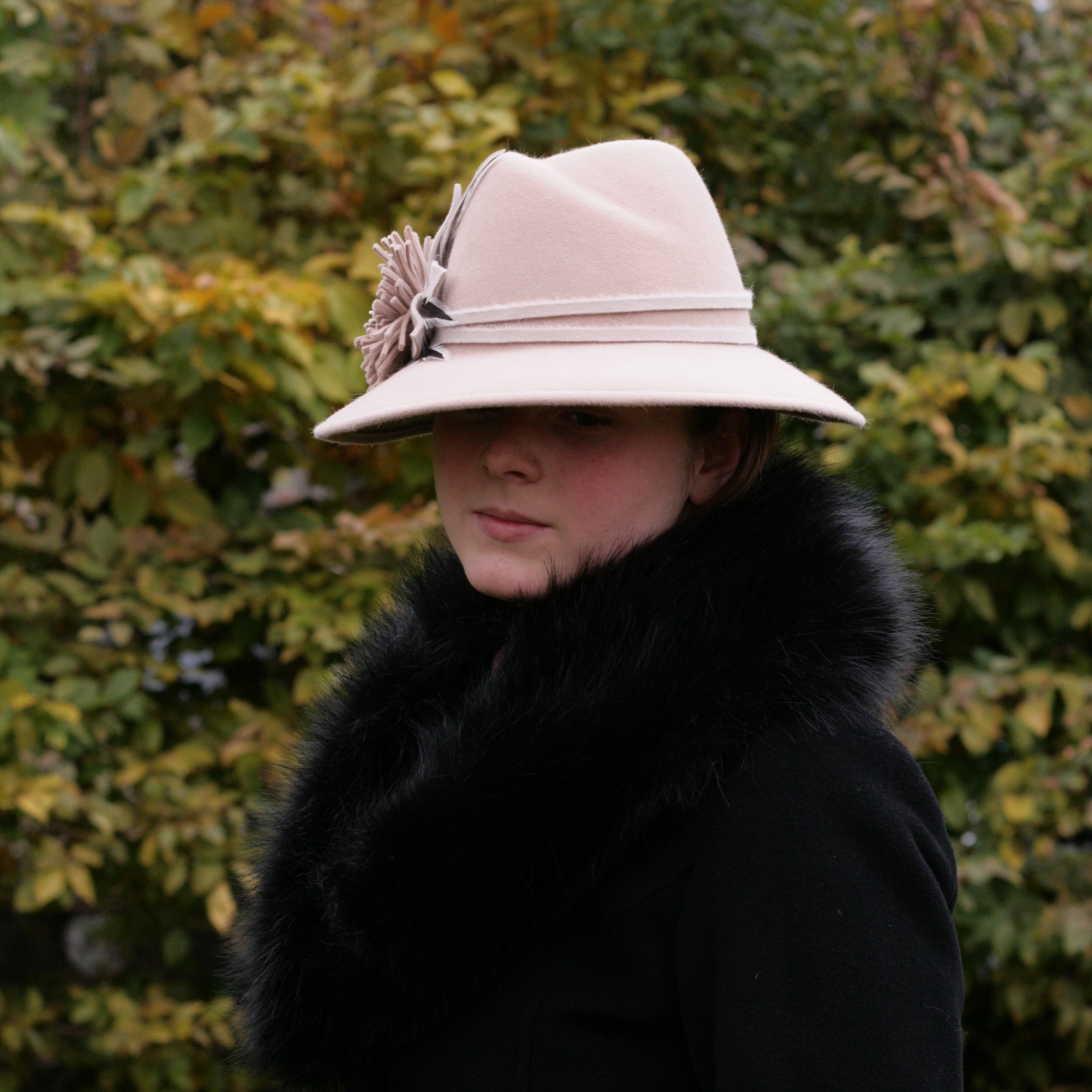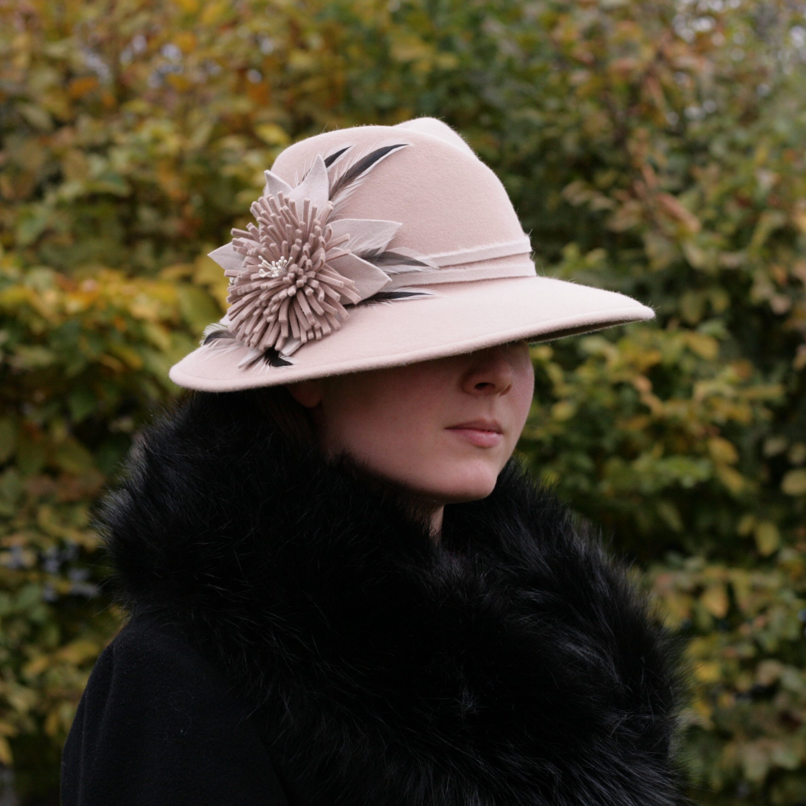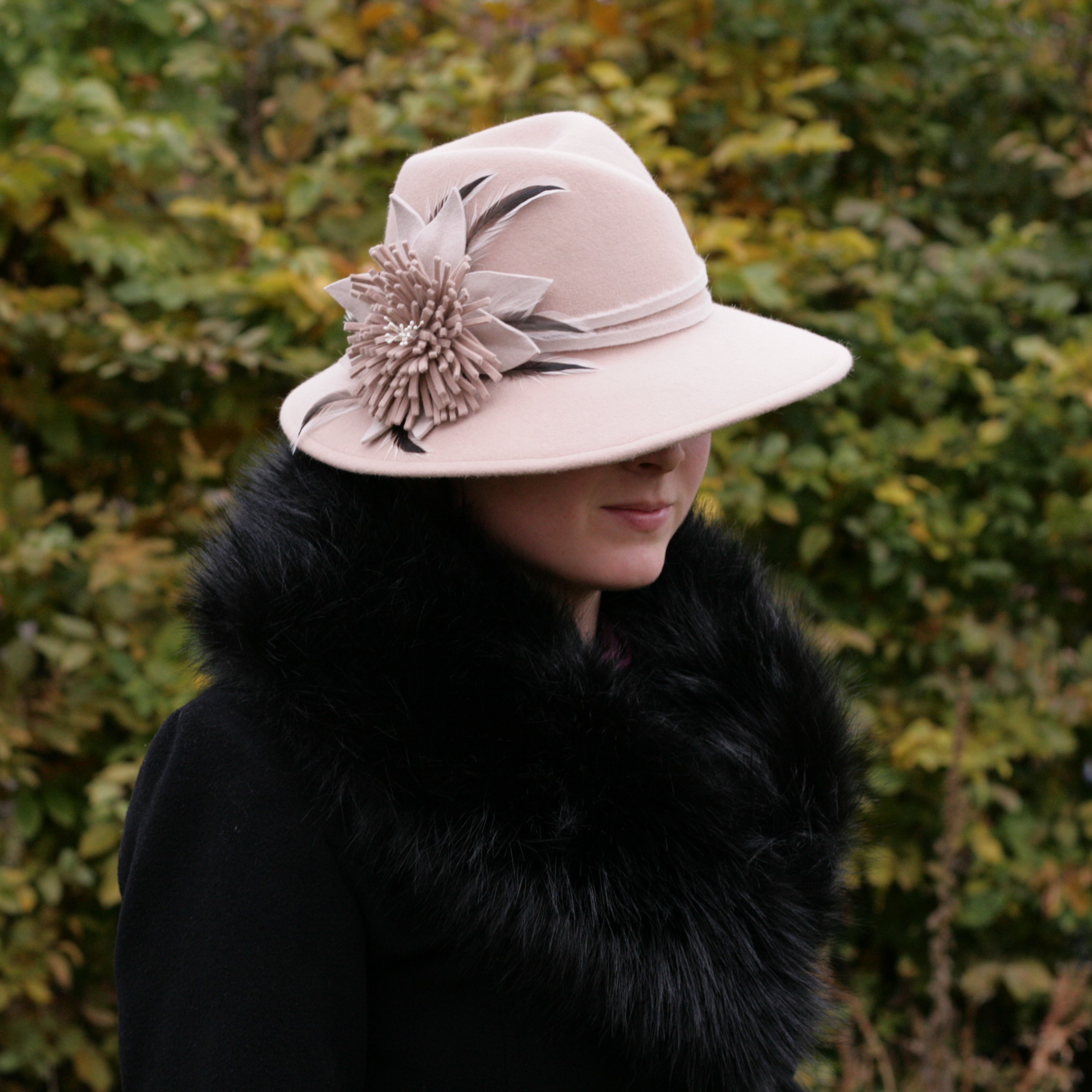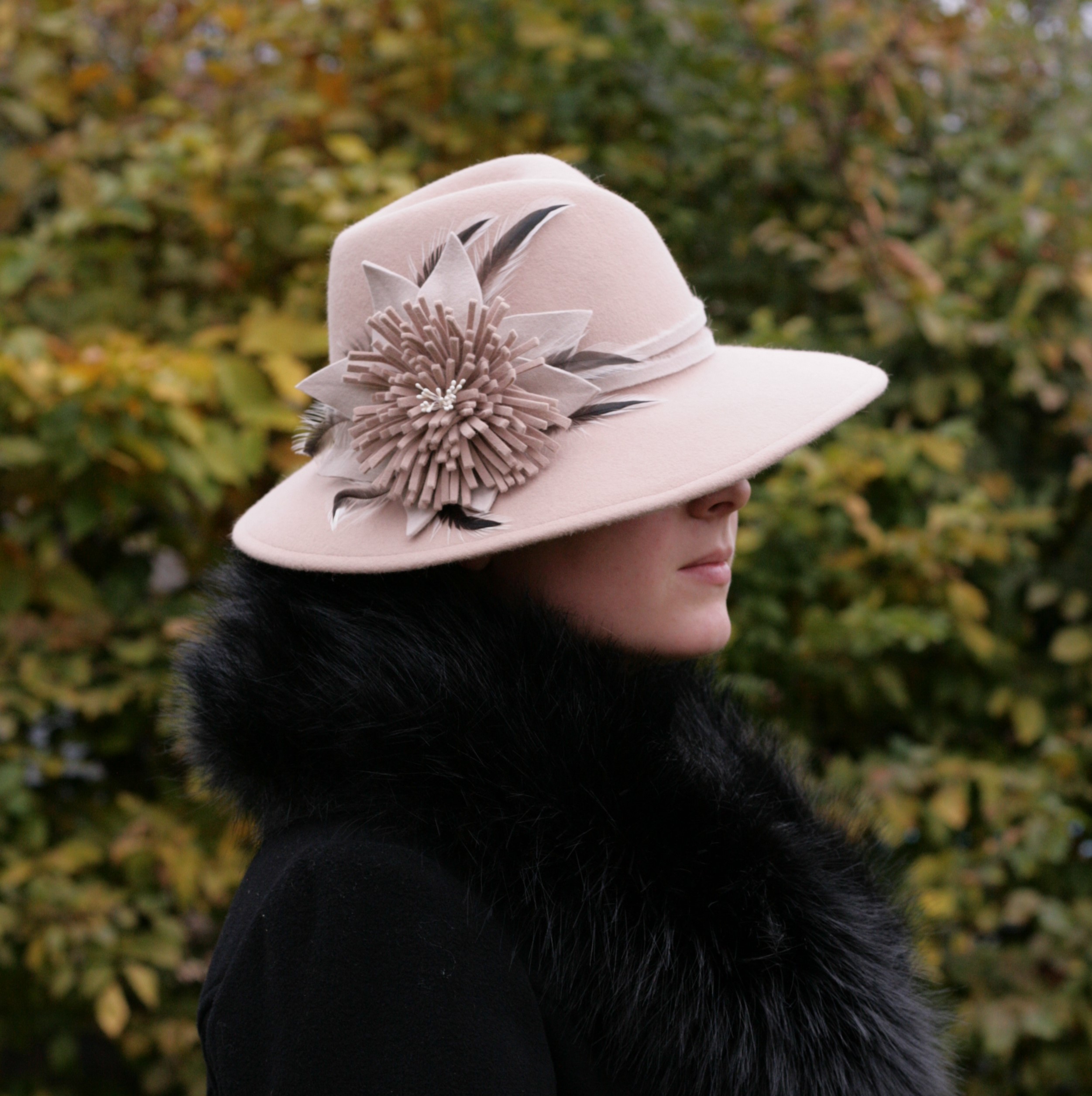 Plstěný béžový klobouk s květem Béžový klobouk s květem z králičí plsti od firmy Tonak s plstěným květem smetanové a béžové barvy, doplněný kohoutím peřím. Celý tvarovaný a šitý ručně.