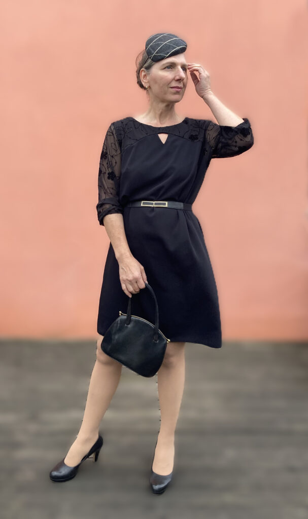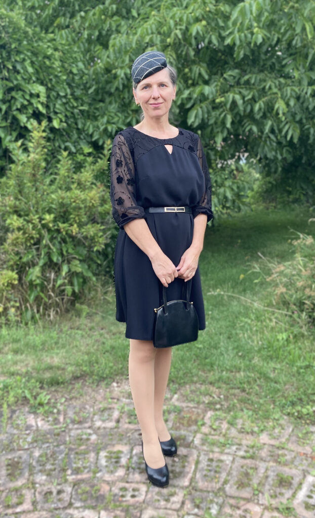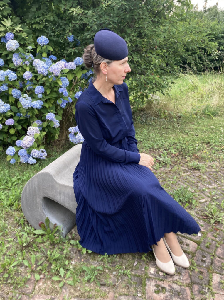 Modré šaty s plstěným baretem, tvořeným na historické formě. Malé černé šaty s minimalistickým barýtkem ze sisálové sítě sinamy.