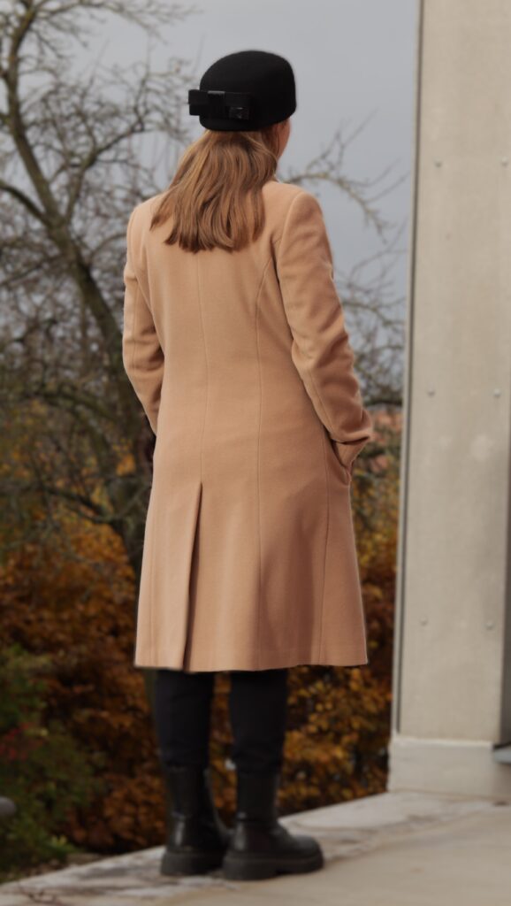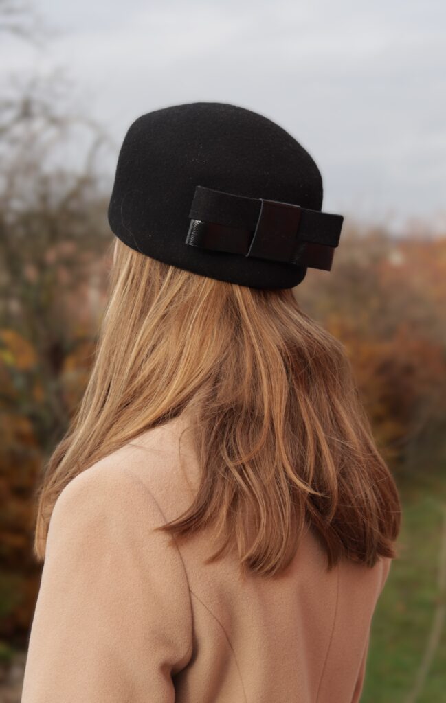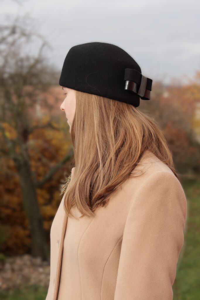 Tuto toku, z ovčí vlny, jsem tvarovala na historické formě ve stylu 50. let. Na mašli jsem použila stejný materiál, kombinovaný s černou lesklou kůží.