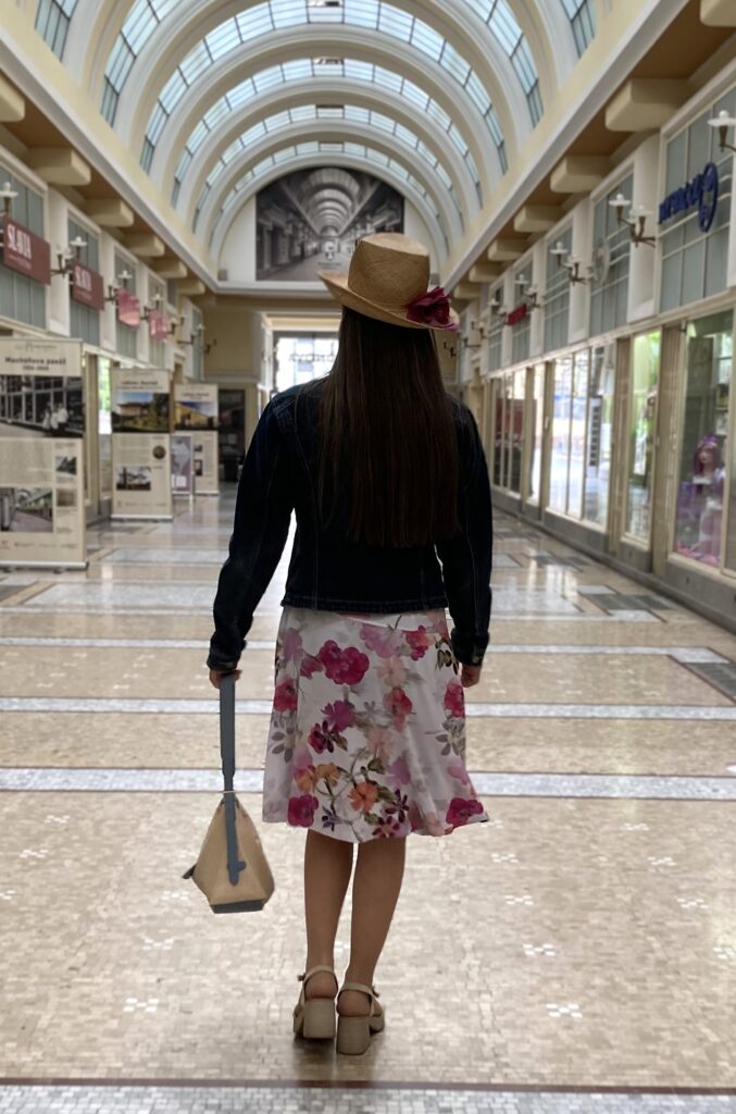 Na procházku po Pardubicích jsem si vzala slamák, na který jsem vytvořila hedvábnou růži ve stejné barvě jako jsou květy na šatech.