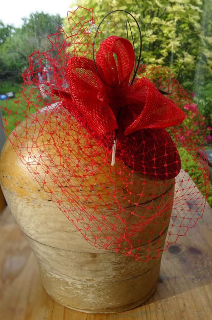 Pro tento fascinátor, na přání, jsem vyrobila základ ze sinamy a stejně tak dominantní mašli, kterou jsem dozdobila dlouhým ostnem z kohoutího brka stočeným do spirály a zakončeným šipkou. Vše doplňuje francouzský závoj ve stejné barvě.