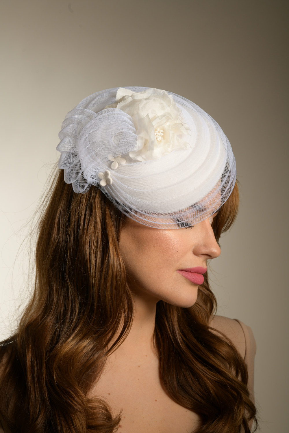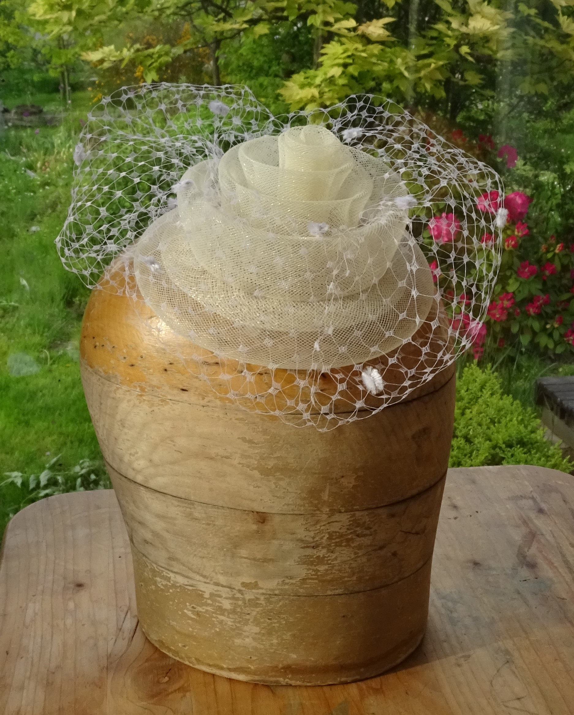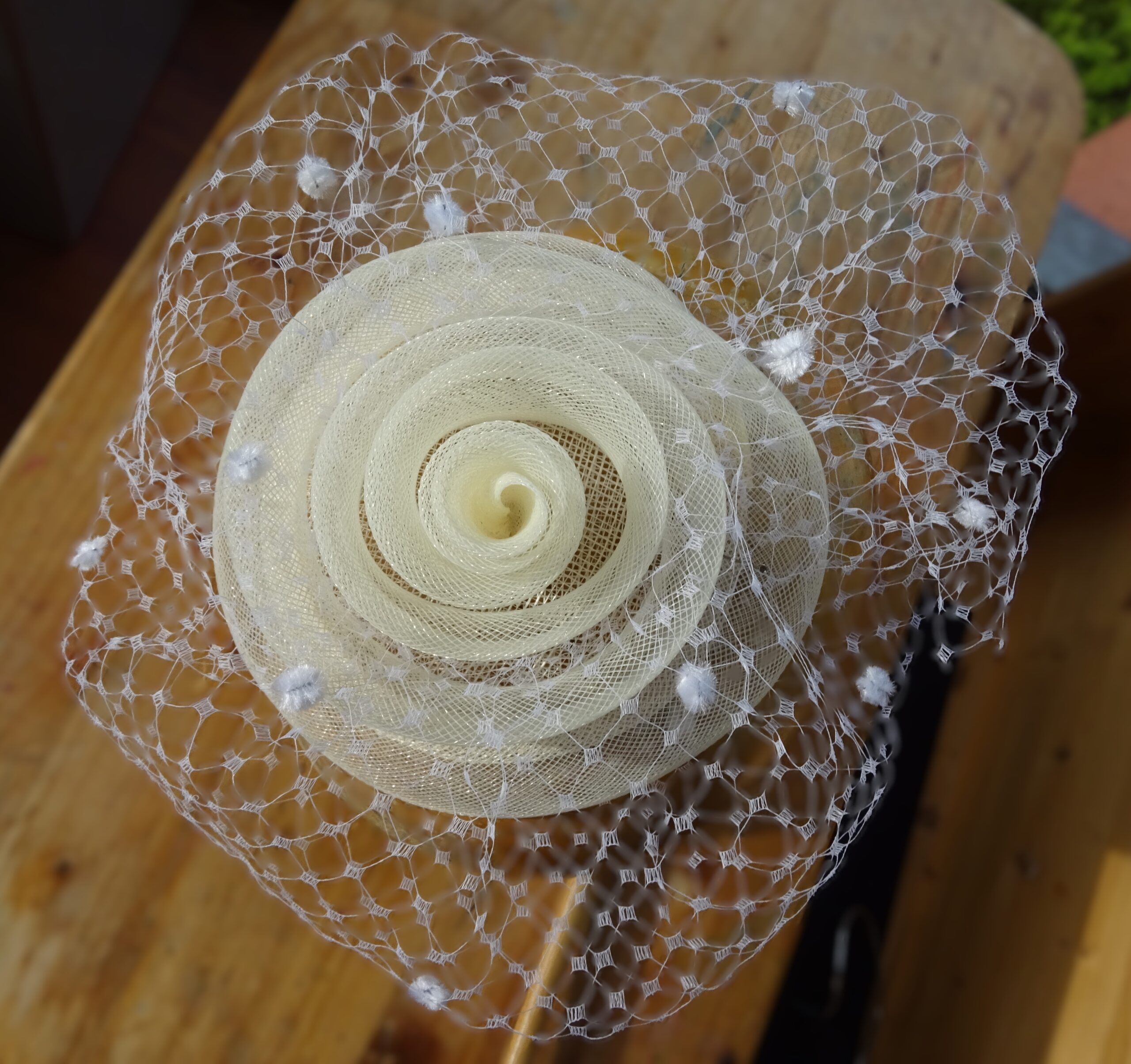 Základ jsem vytvarovala ze smetanově bílé králičí plsti a nazdobila bílou horizontální modistickou krinolínou, která tvoří malý závojíček nad okem. Na vrch jsem posadila růži z hedvábí, rovněž smetanové barvy.. Zde vidíte podobný: https://emma-wolf.cz/produkt/cerveny-fascinator-textilni-kvet/