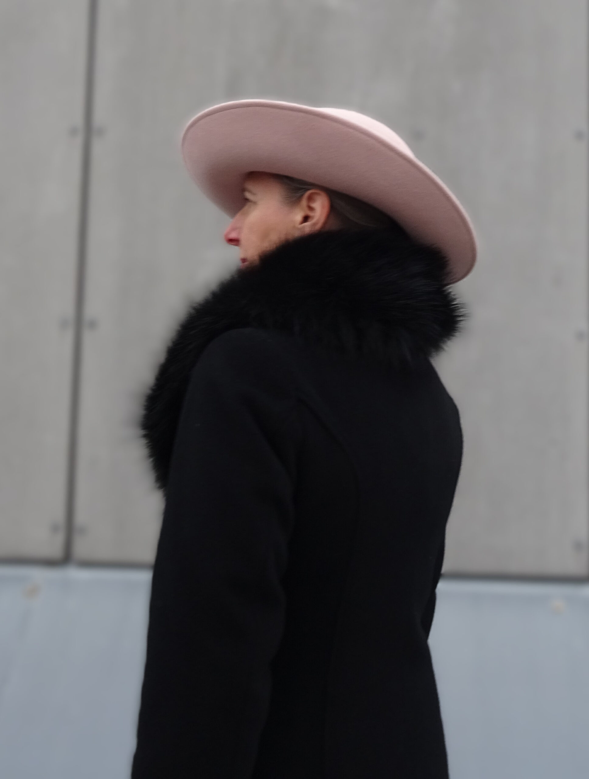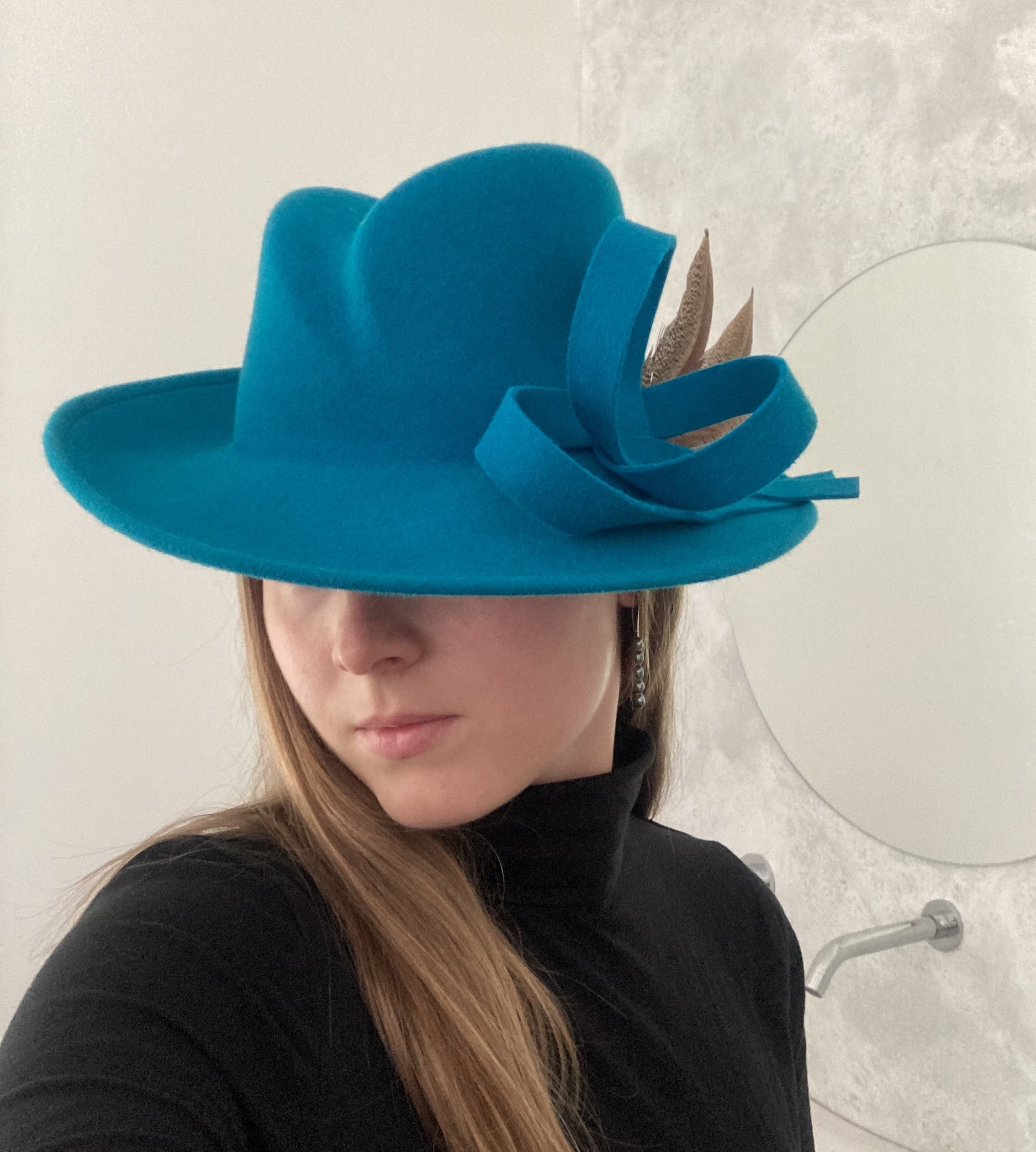 Asymetricky zvednutá krempa ke straně vytváří neobvyklou šikmou linii, při pohledu zepředu. Tento větší nepřehlédnutelný klobouk jsem nazdobila kohoutím peřím a plstěnými kličkami. Dobře se kombinuje s černým kabátem a se šaty v barvě klobouku.