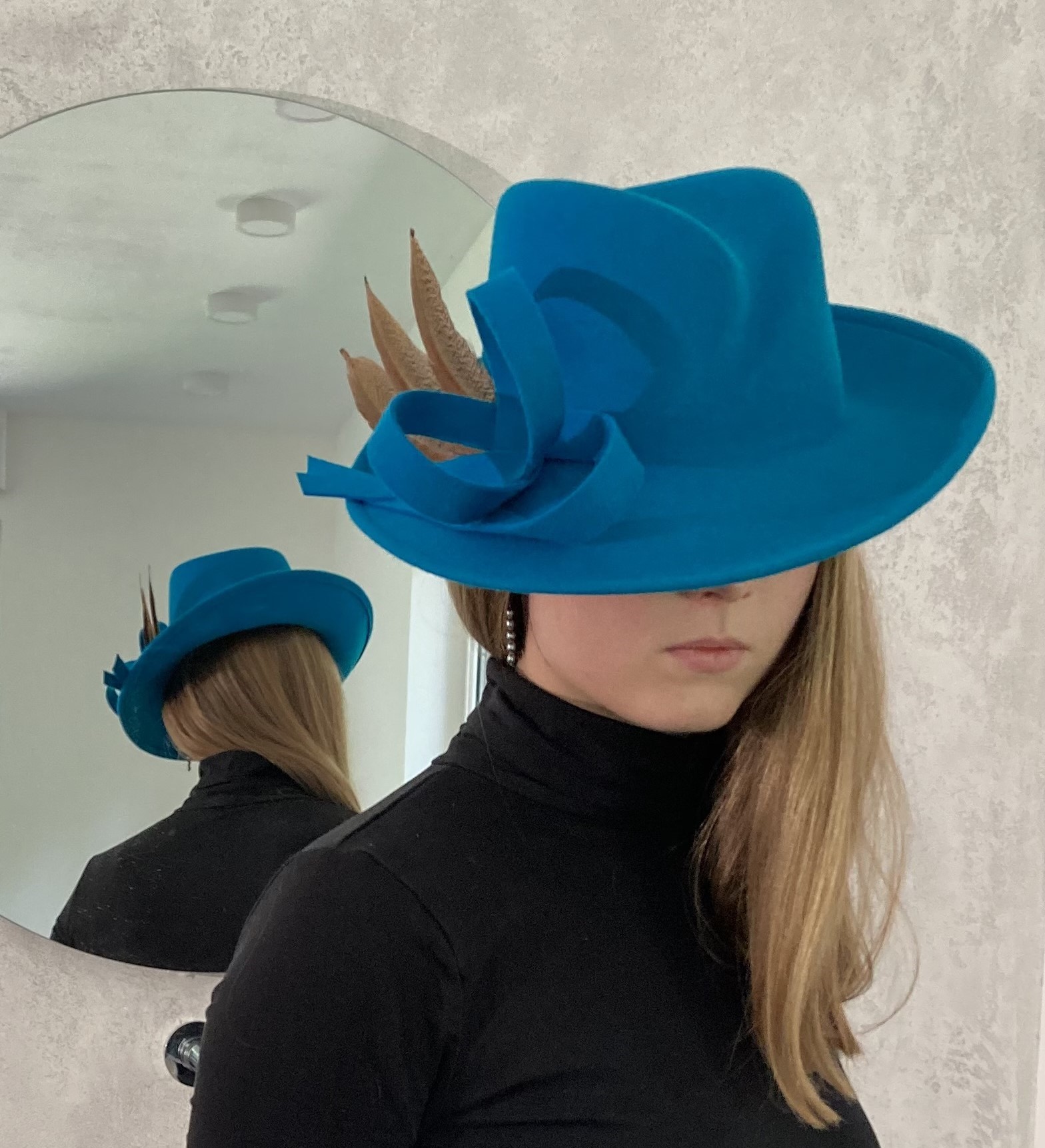Pro tento klobouk jsem vytvořila dekorace z kohoutího peří v podobě malého vějíře a květu, které doplňuje plstěný uzel. Barvy peří vytváří s kloboukem krásný harmonický kontrast. Slaďte si outfit v těchto barvách.