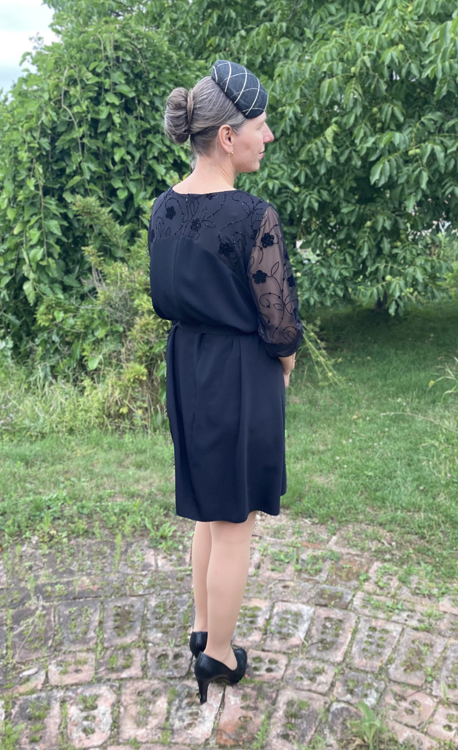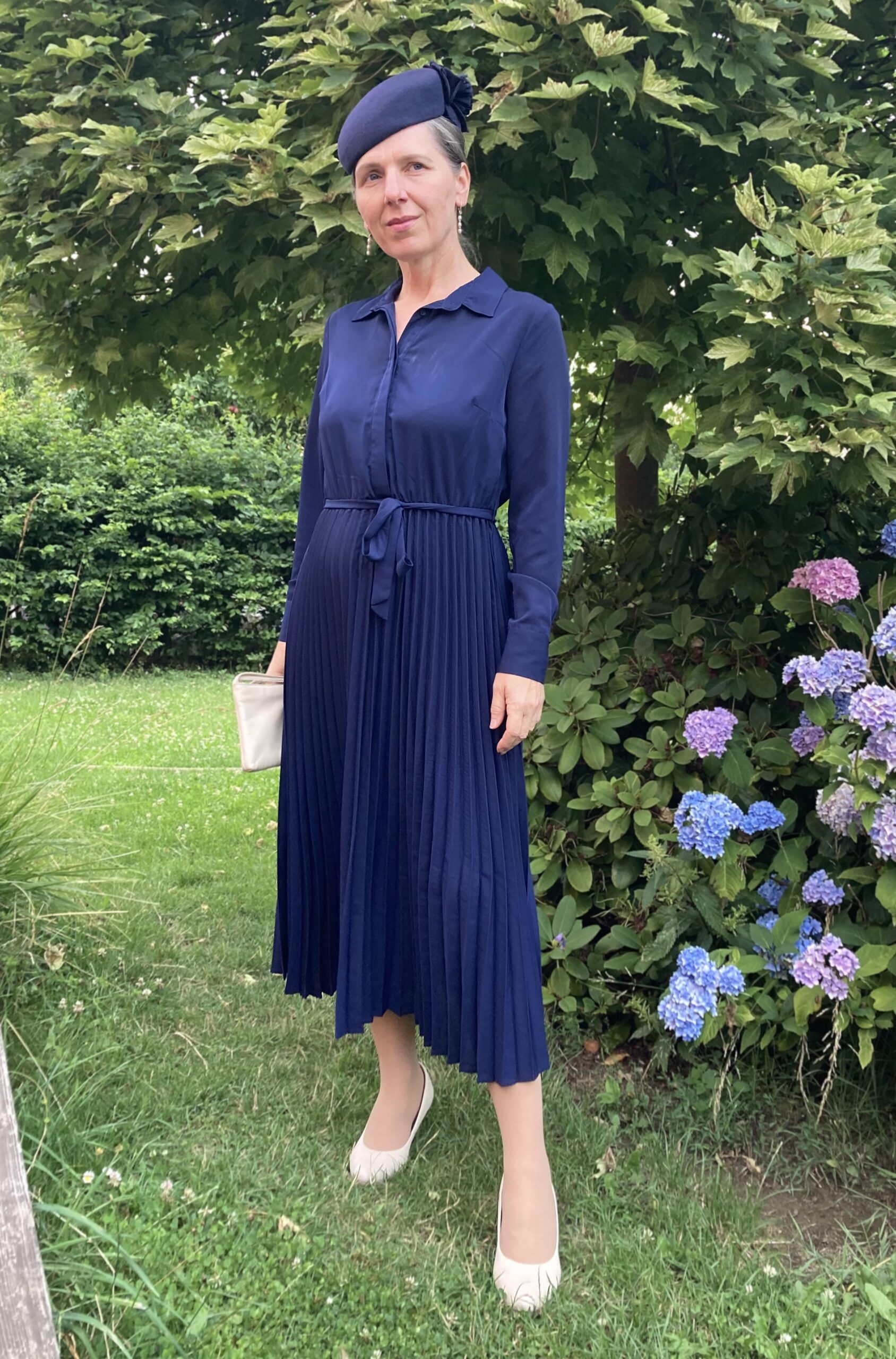 Modré šaty s plstěným baretem, tvořeným na historické formě. Malé černé šaty s minimalistickým barýtkem ze sisálové sítě sinamy.