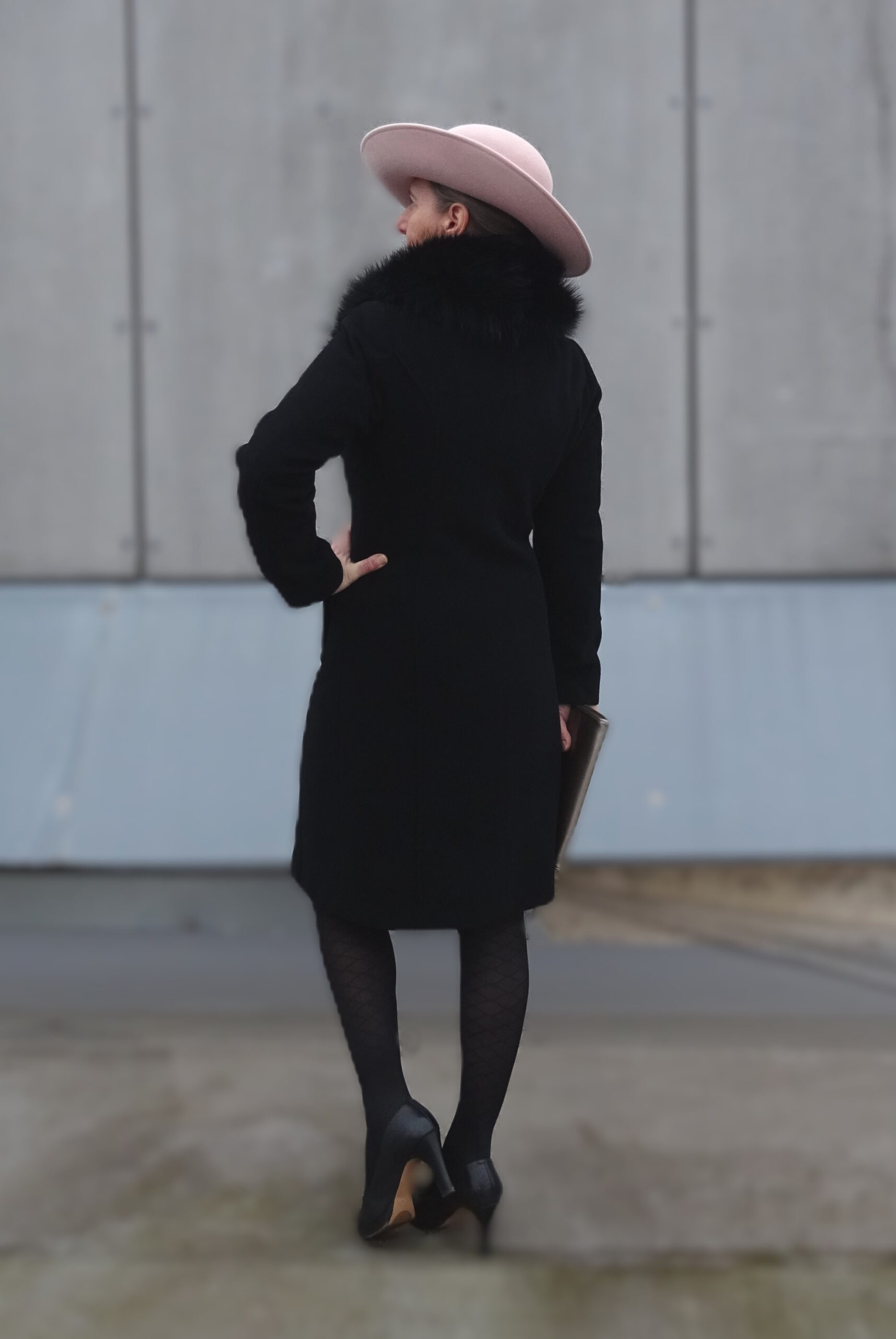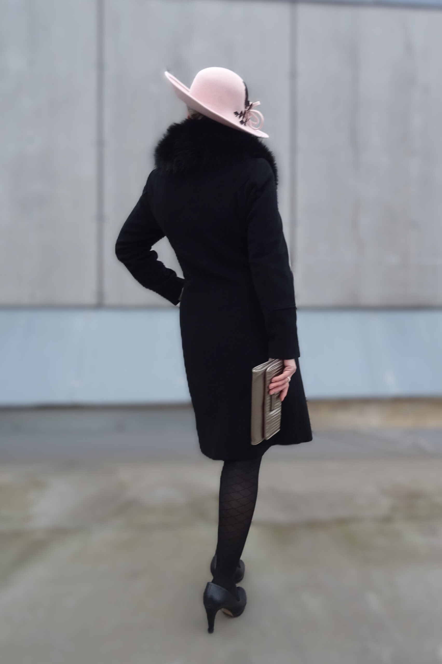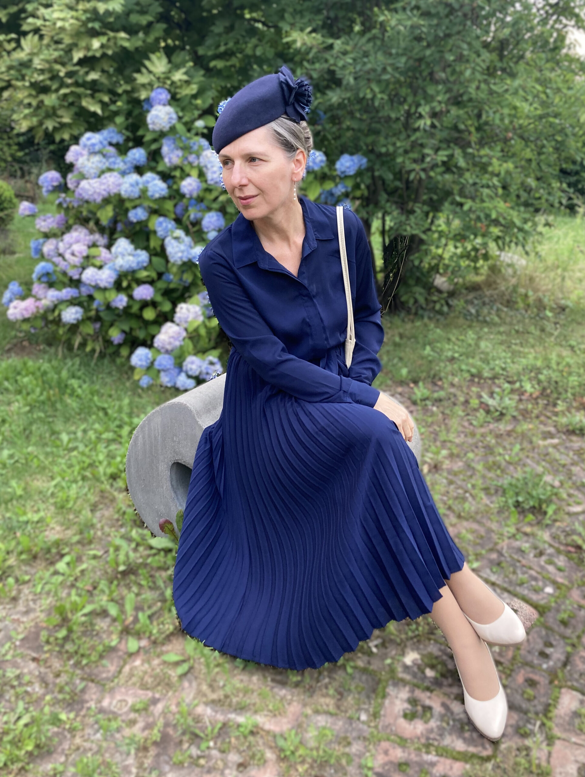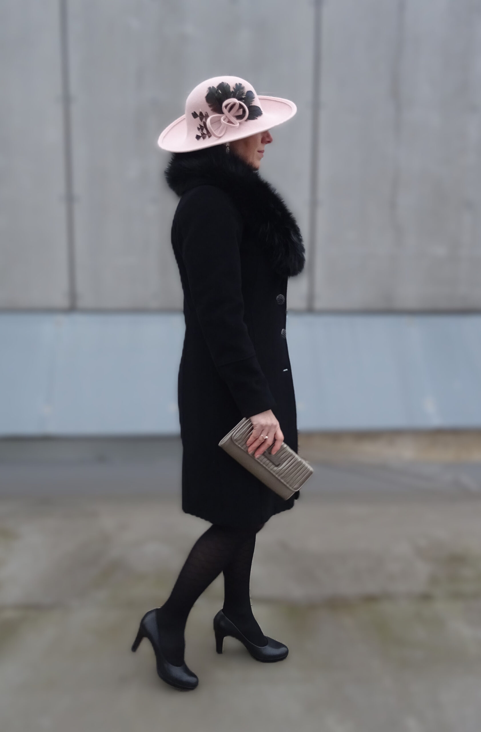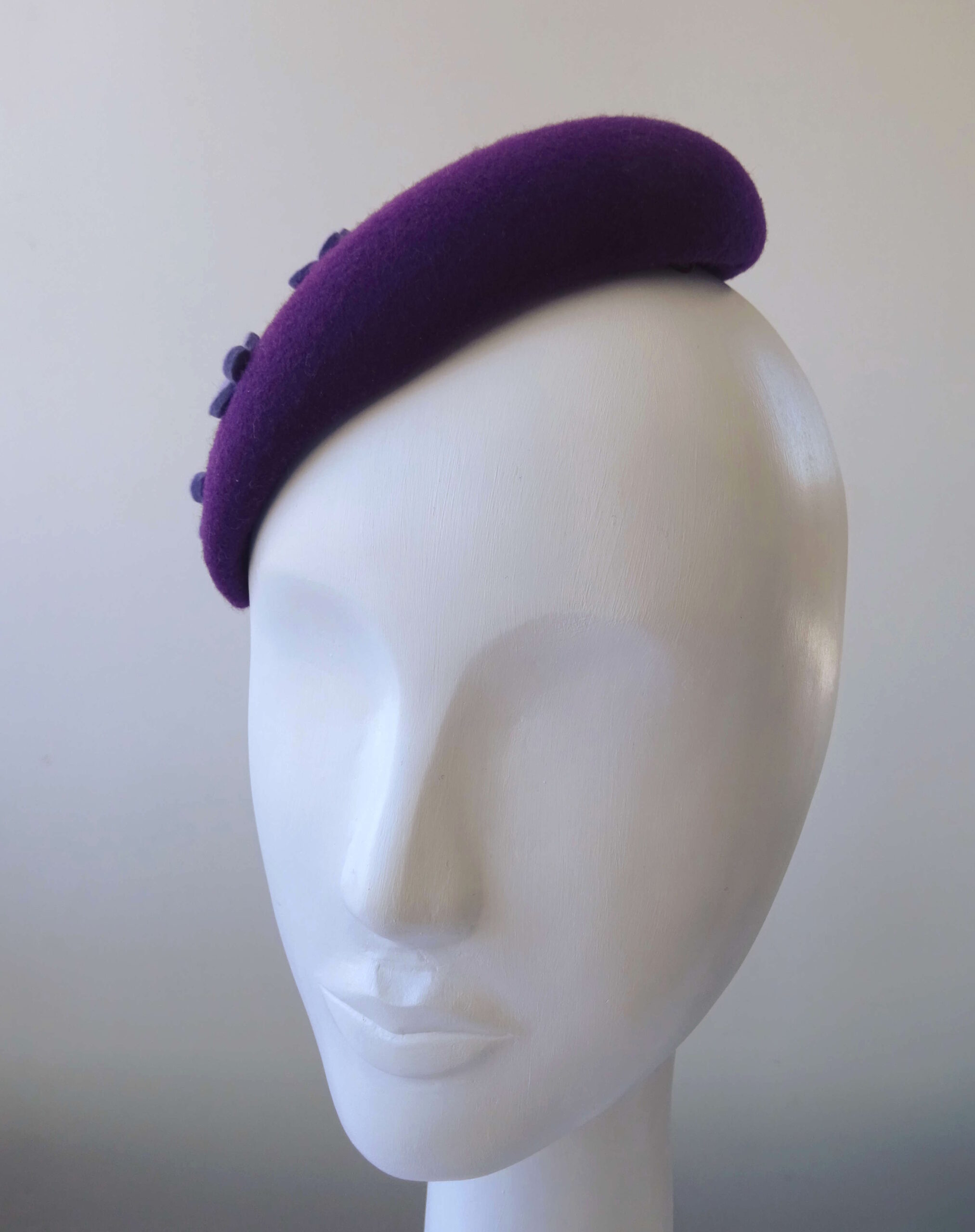 Tuto toku, z ovčí vlny, jsem tvarovala na historické formě ve stylu 50. let. Na mašli jsem použila stejný materiál, kombinovaný s černou lesklou kůží.