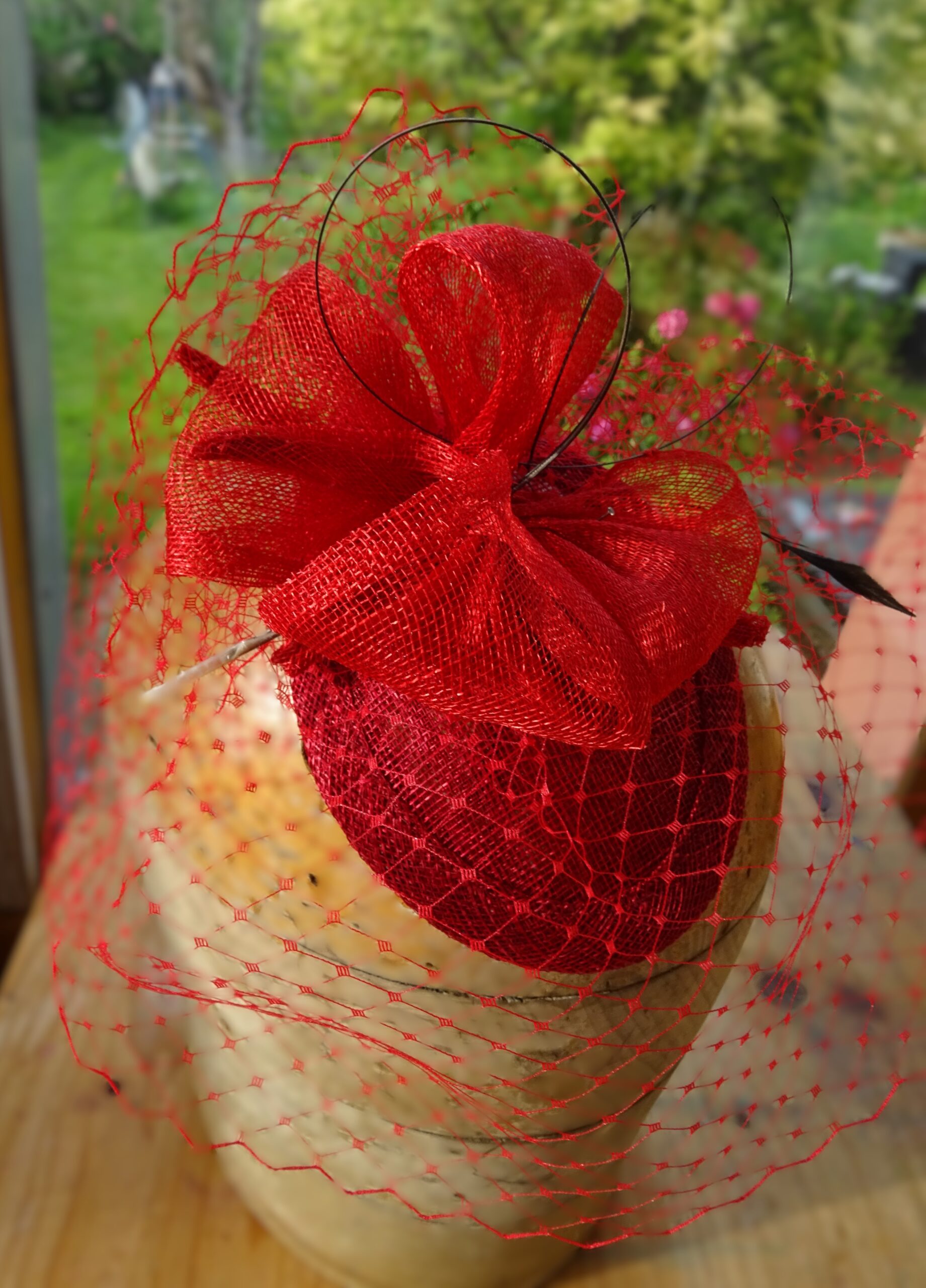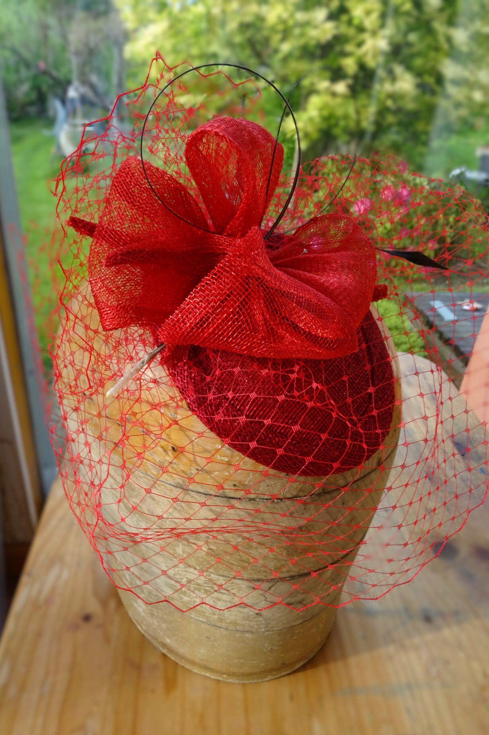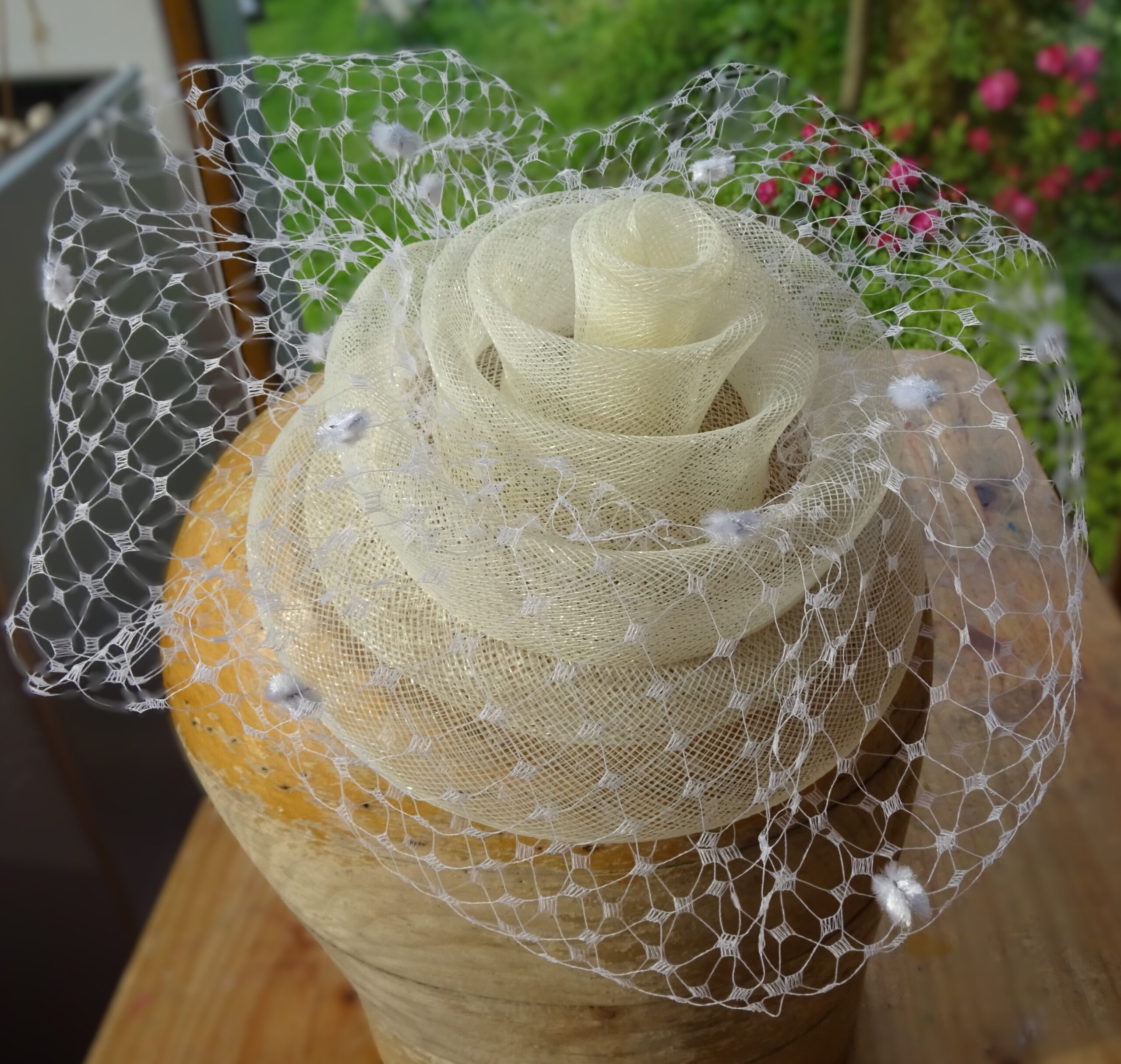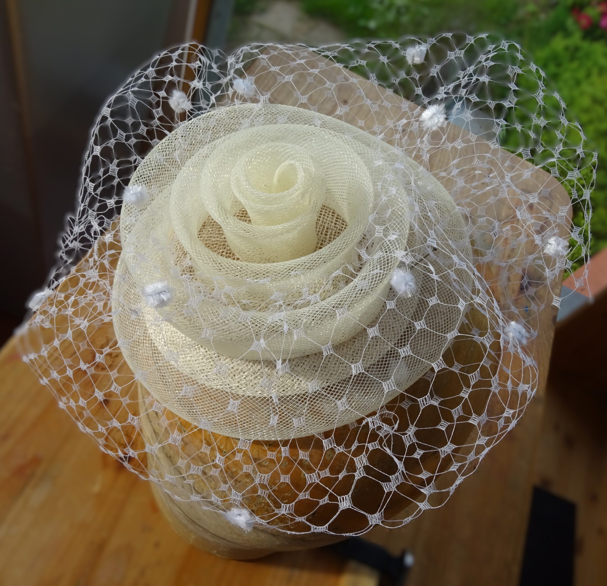 Pro tento fascinátor jsem vytvořila kruhový základ ze sinamy a na něj naaplikovala maxi růži z modistické krinolíny. Vše jsem doplnila bílím francouzským závojem s nopky.. Mrkněte na další fascinátory: https://emma-wolf.cz/kategorie-produktu/fascinatory/