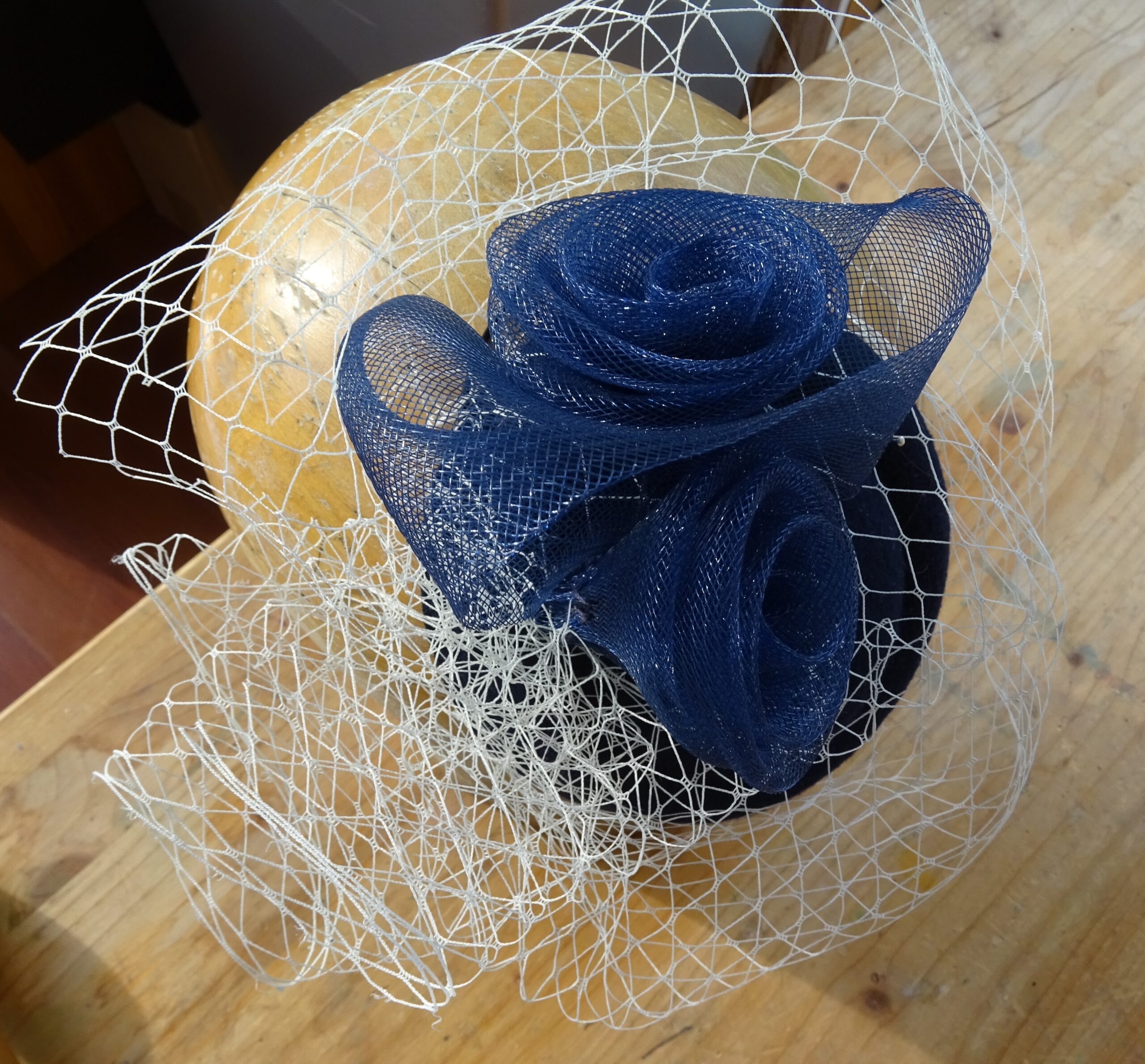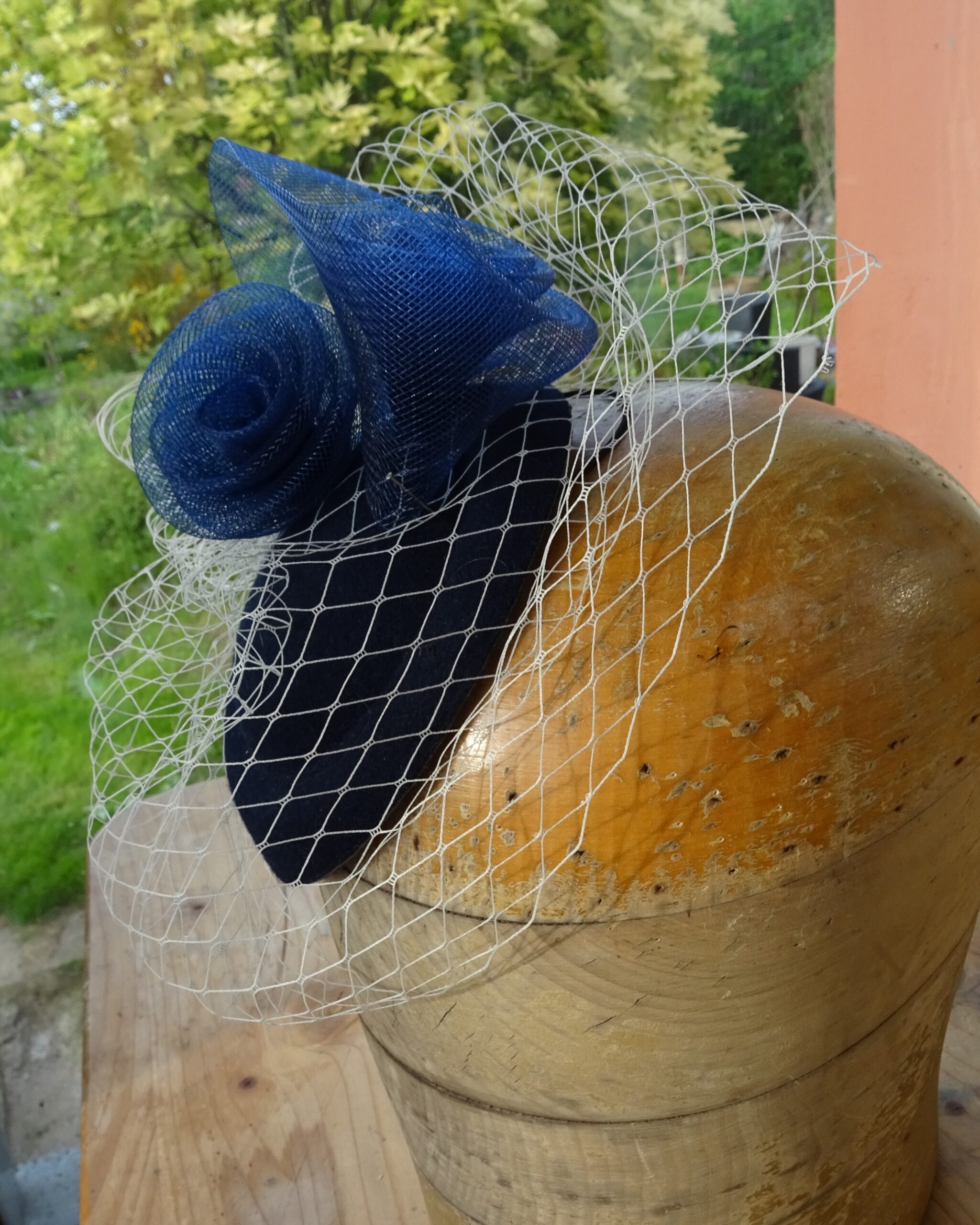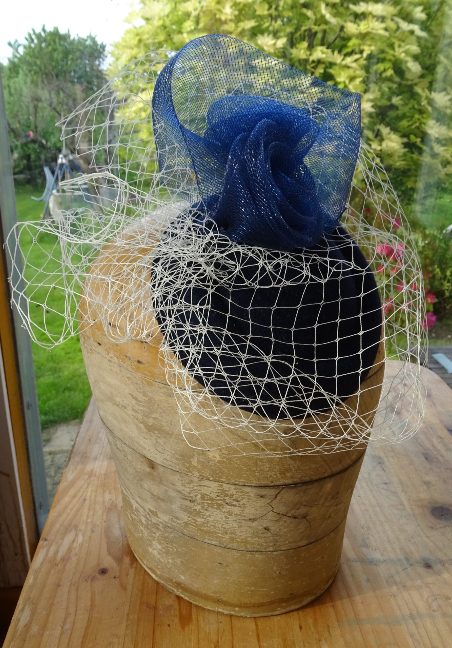 Na tmavě modrém sametovém základu jsem stočila dvě růže z modistické krinolíny a doplnila francouzským závojem v kontrastní bílé barvě.. Zde můžete vidět další menší fascinátor: https://emma-wolf.cz/produkt/ruzovy-letni-fascinator/