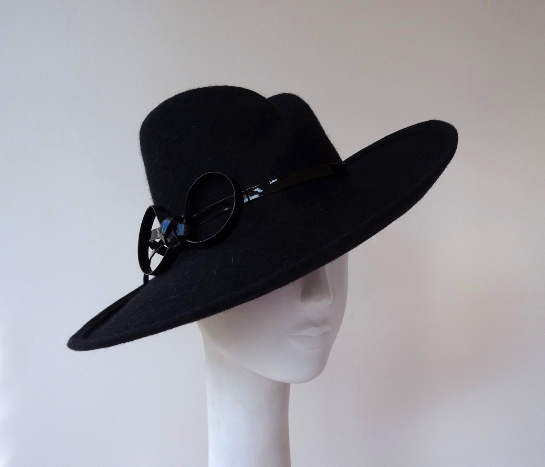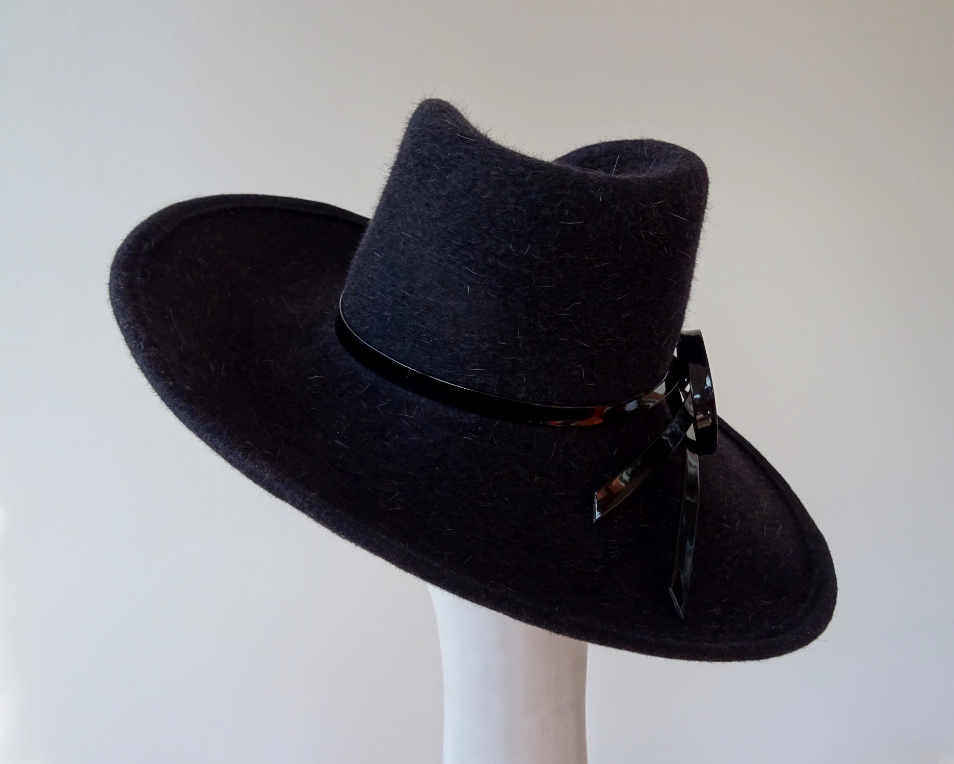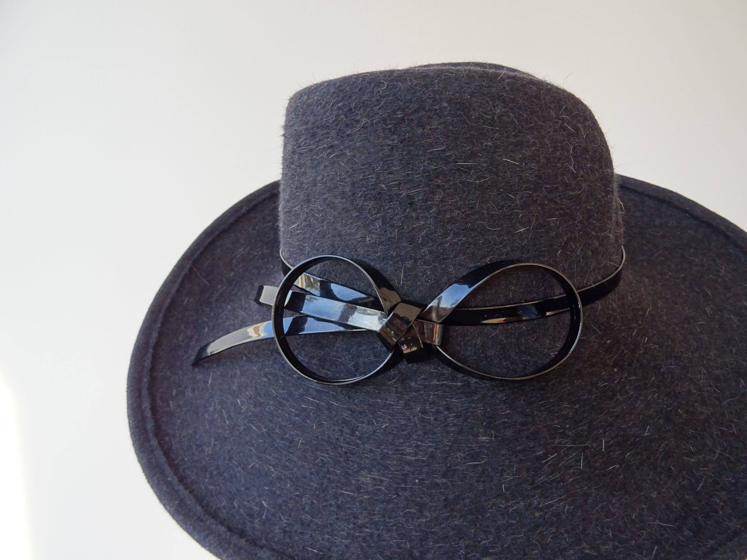 Antracitový klobouk s lesklou mašlí – na přání Vám mohu vyrobit podobný v jiné barvě, která se bude hodit k Vašemu kabátu či šatům. Má zvednutou krempu k jedné straně a výrazně tvarovanou hlavičku. Pro výrobu jsem použila králičí plsť s dlouhým chlupem, který se dá krásně učesat. Dekoraci, v podobě mašle, jsem vytvořila z lesklého pásku, který krásně kontrastuje s huňatým materiálem.