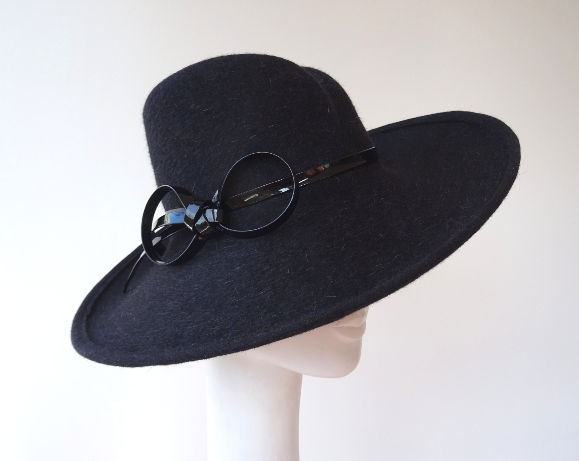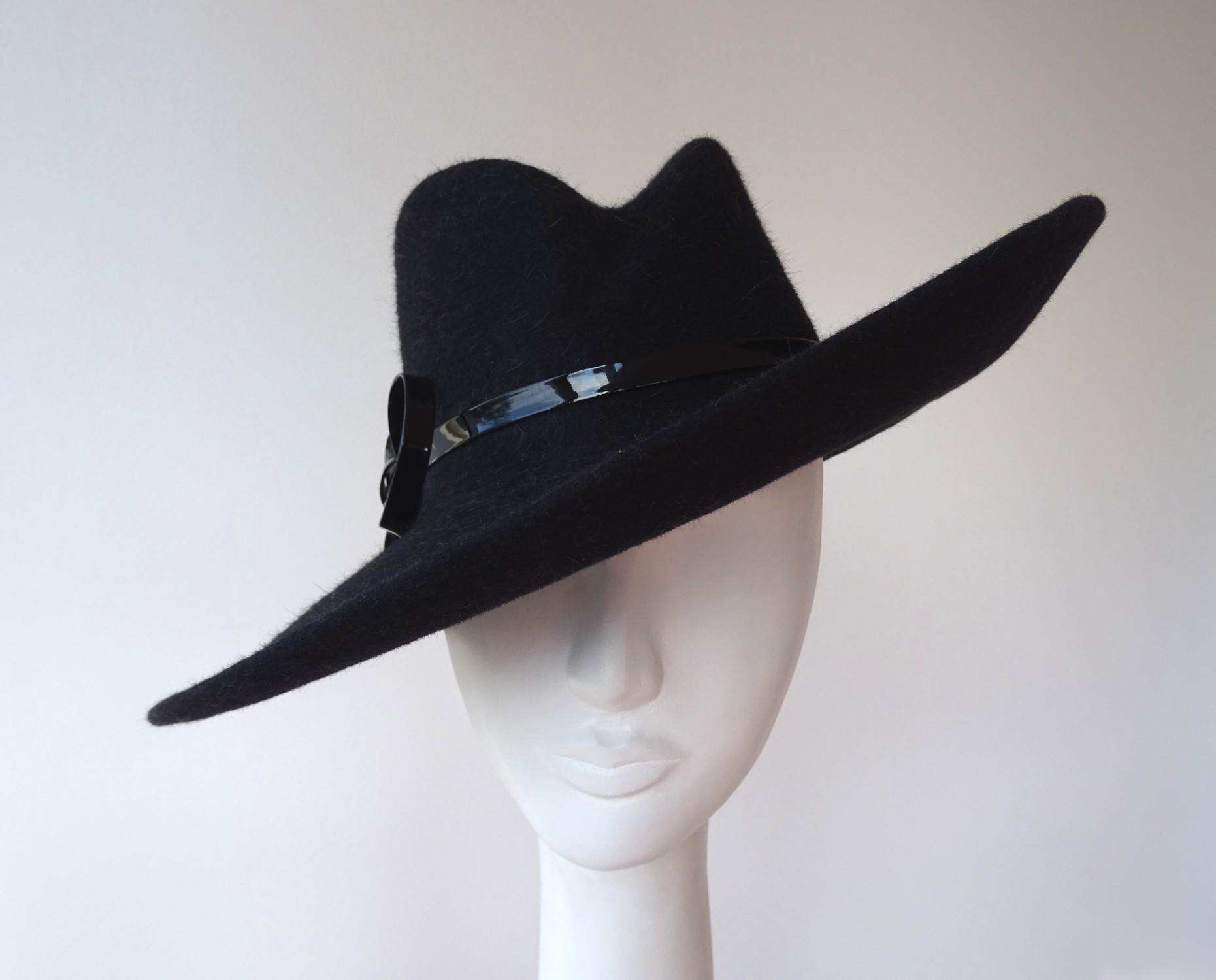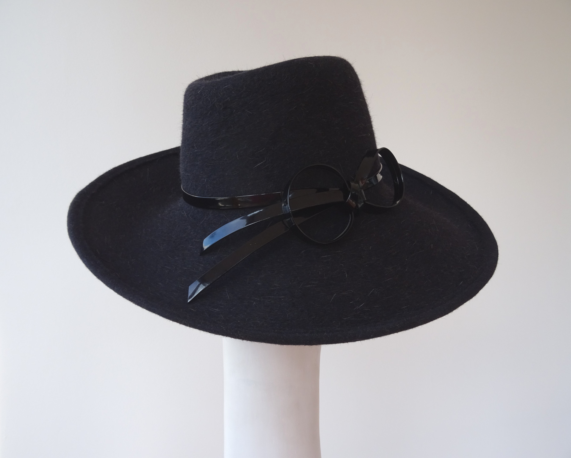 Antracitový klobouk s lesklou mašlí – na přání Vám mohu vyrobit podobný v jiné barvě, která se bude hodit k Vašemu kabátu či šatům. Má zvednutou krempu k jedné straně a výrazně tvarovanou hlavičku. Pro výrobu jsem použila králičí plsť s dlouhým chlupem, který se dá krásně učesat. Dekoraci, v podobě mašle, jsem vytvořila z lesklého pásku, který krásně kontrastuje s huňatým materiálem.