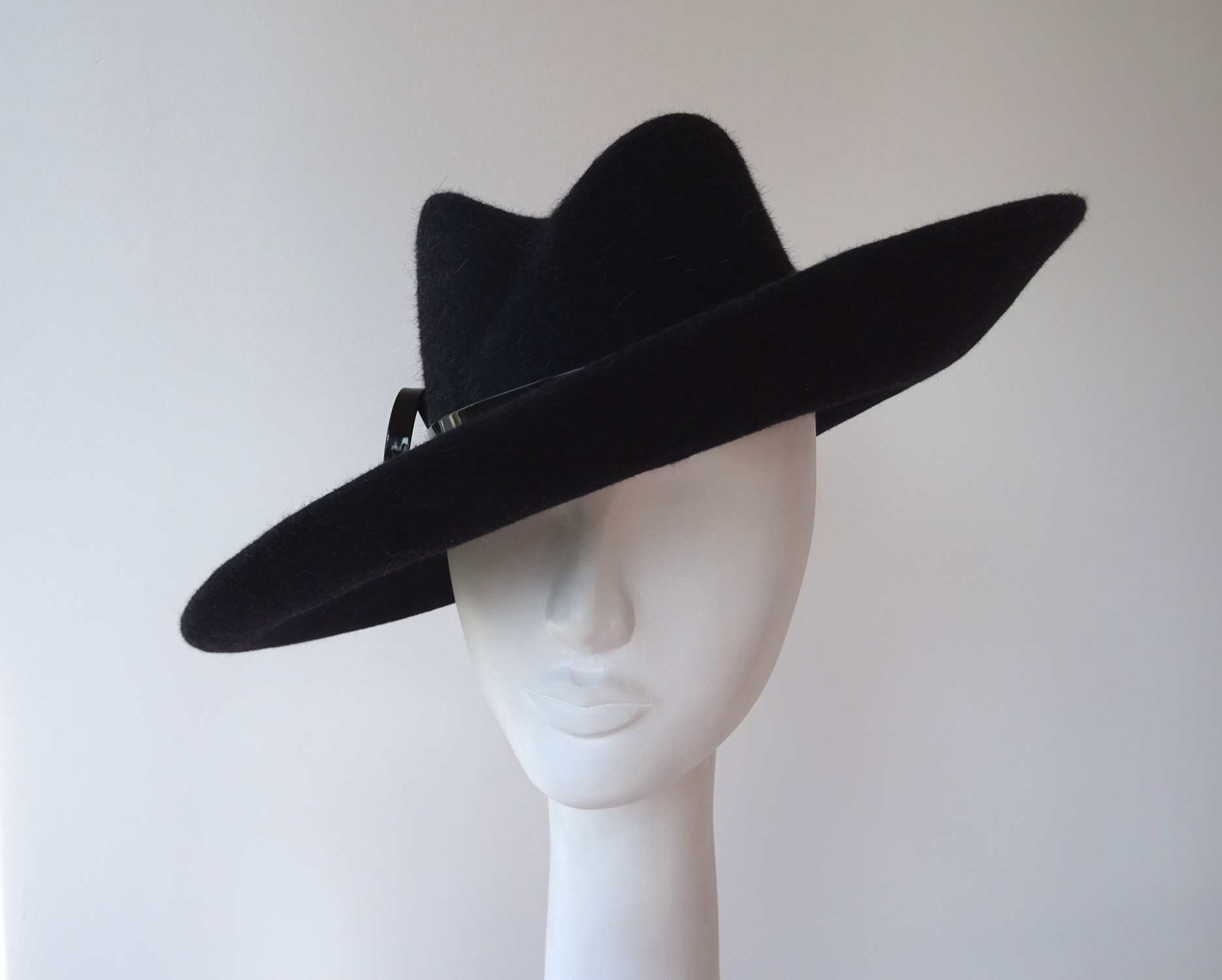 Tento typ klobouku zaujme především svým tvarem. Můžete ho využít na slavnostní i smuteční příležitosti, dostihy, párty, ale i jen tak do města, když chcete zaujmout. Noste jej ke kostýmku nebo kabátu. S tímto jedinečným módním doplňkem budete nepřehlédnutelná, zahřeje Vás a zároveň se pod něj můžete schovat. Cena 5500-6000, podle materiálu a zdobení.